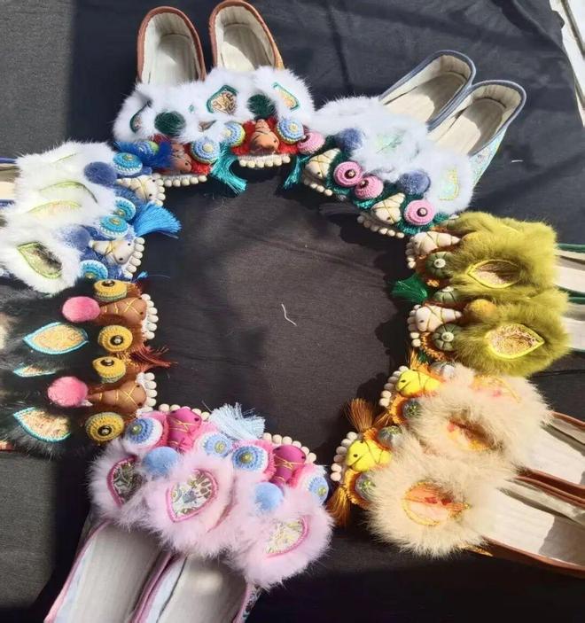 金枝虎头鞋作为承载民俗文化的传统手工艺品,制作工序严谨精巧:经备料(红布、绣线、铃铛等)、设计剪样、缝制底帮、绣制虎头(从鼻至齿精细绣制,金线勾边)、上帮整合到修整装饰,每一步都凝聚匠心;其风格独具地域特色,以鲜艳色彩为基调,造型粗犷夸张,脸、眼、嘴硕大,饰以彩线、珠饰、皮毛等,针脚粗大厚重,尽显山东民俗的豪放与中原文化底蕴;且兼具实用与观赏价值,手工纳底舒适护足,绸缎鞋面透气亲肤,更承载吉祥寓意,其工艺对研究鲁西北民俗与传统技艺具有重要历史文化价值。